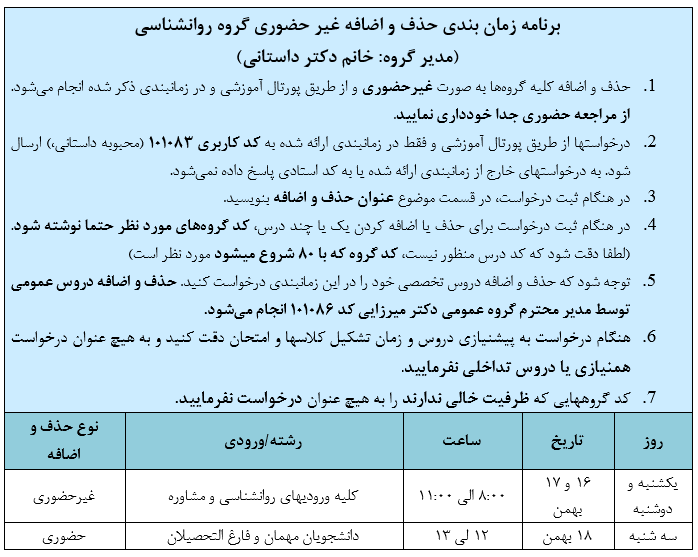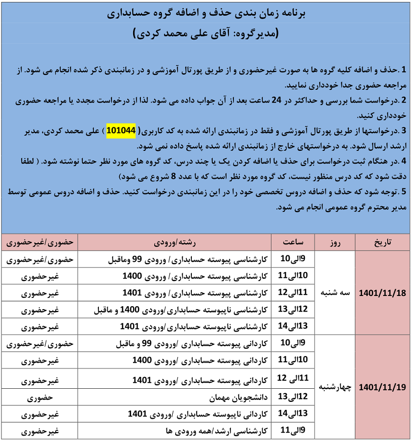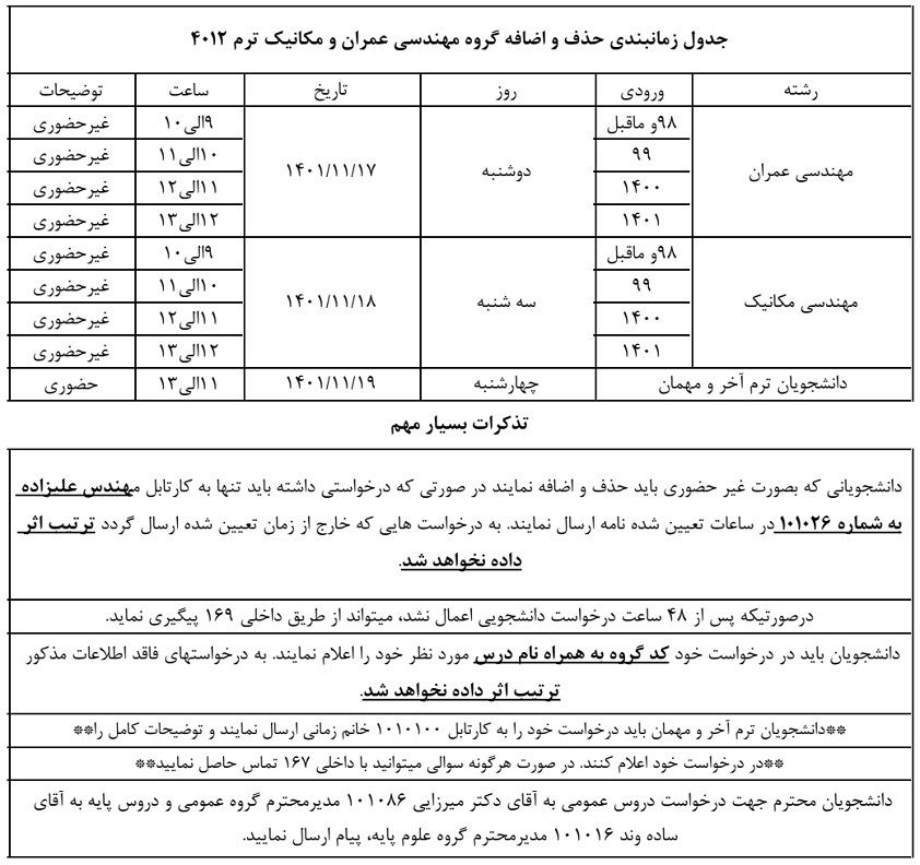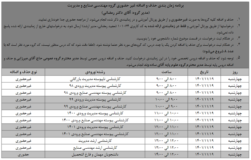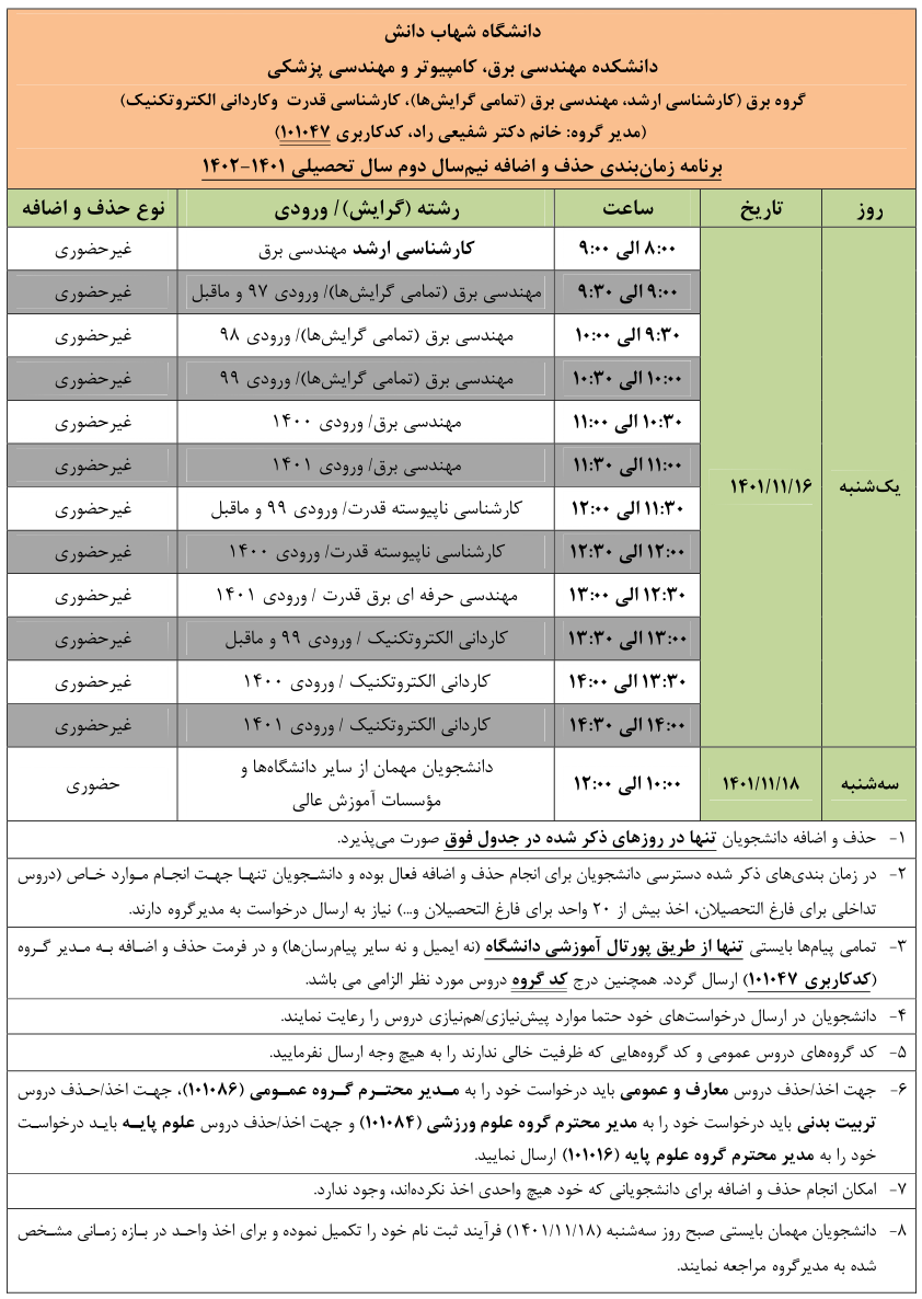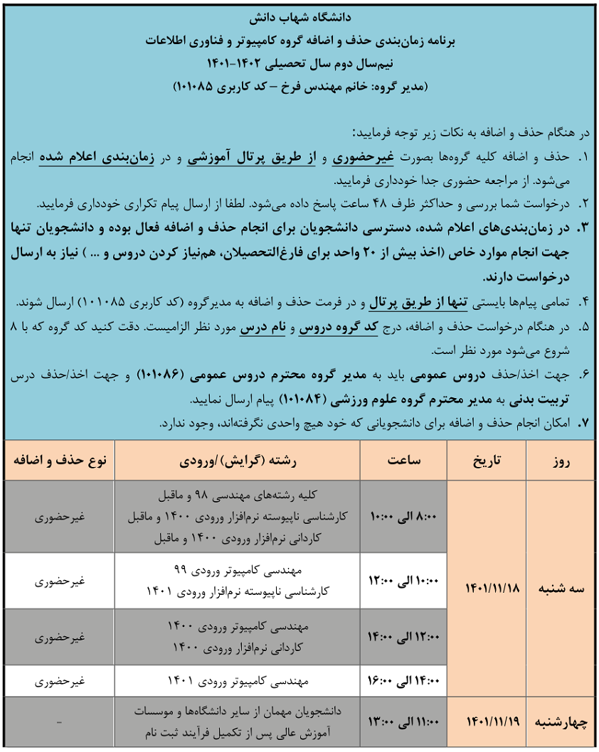 1- حذف و اضافه دانشجویان تنها در روزهای ذکر شده به صورت غیر حضوری در جداول ذیل صورت می پذیرد و پاسخگویی به صورت حضوری امکانپذیر نمی باشد.