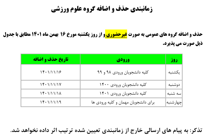 1- در لیست اعلامی در جداول ذیل برای هر گروه زمان مشخصی برای ارسال پیامهای درخواست حذف و اضافه تعیین شده است. تنها پیامهایی که در همان بازه ارسال شوند توسط مدیر گروه بررسی خواهند شد و پیامهای قبل و بعد از بازه زمانی ذکر شده از سیستم حذف و پاسخی داده نمی شود و به هیچ عنوان مدیر گروه به صورت حضوری پاسخگو نمی باشد.