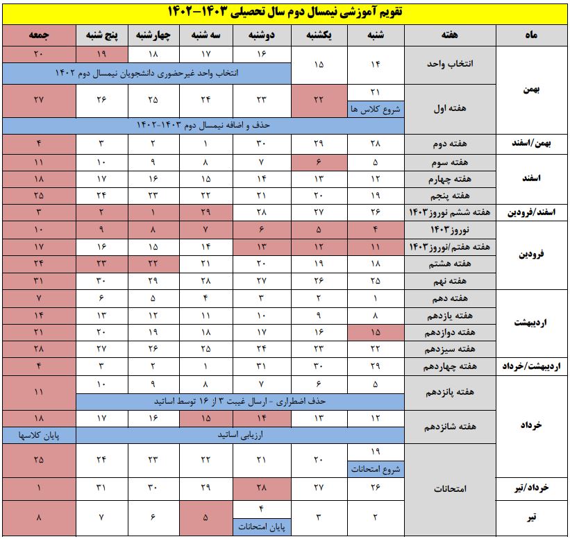 تقویم آموزشی نیمسال دوم 1403-1402