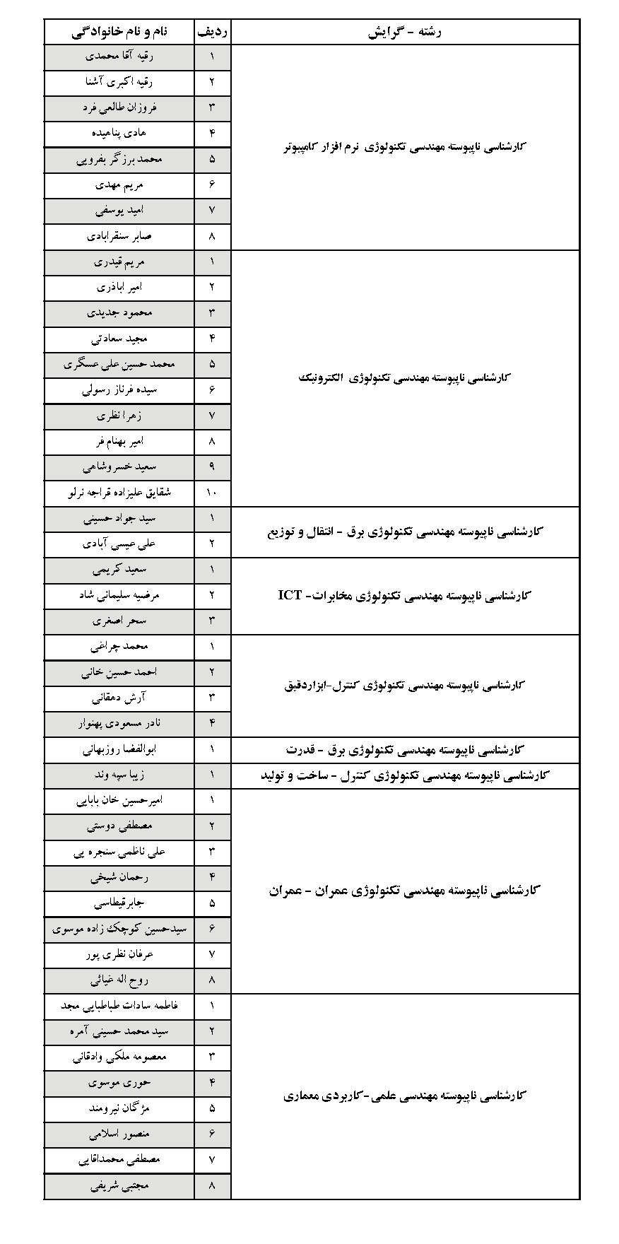 لیست دانشجویان ورودی بهمن 91 (تکمیل ظرفیت) دارای نقص مدرک