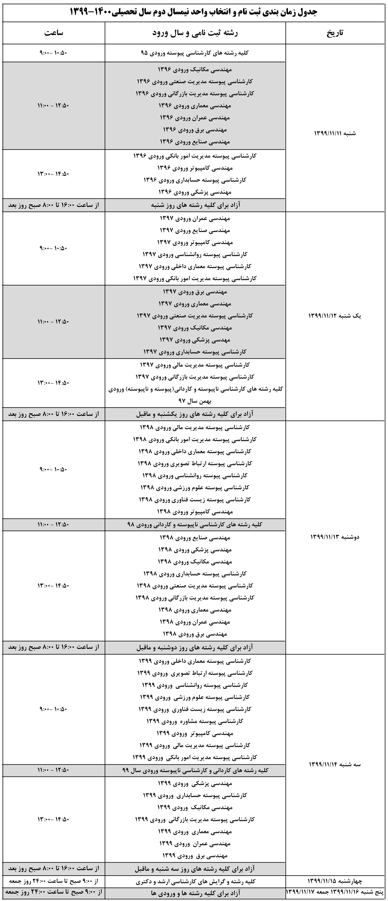 جدول زمانبندی انتخاب واحد اینترنتی ترم دوم سال تحصیلی 1400-1399