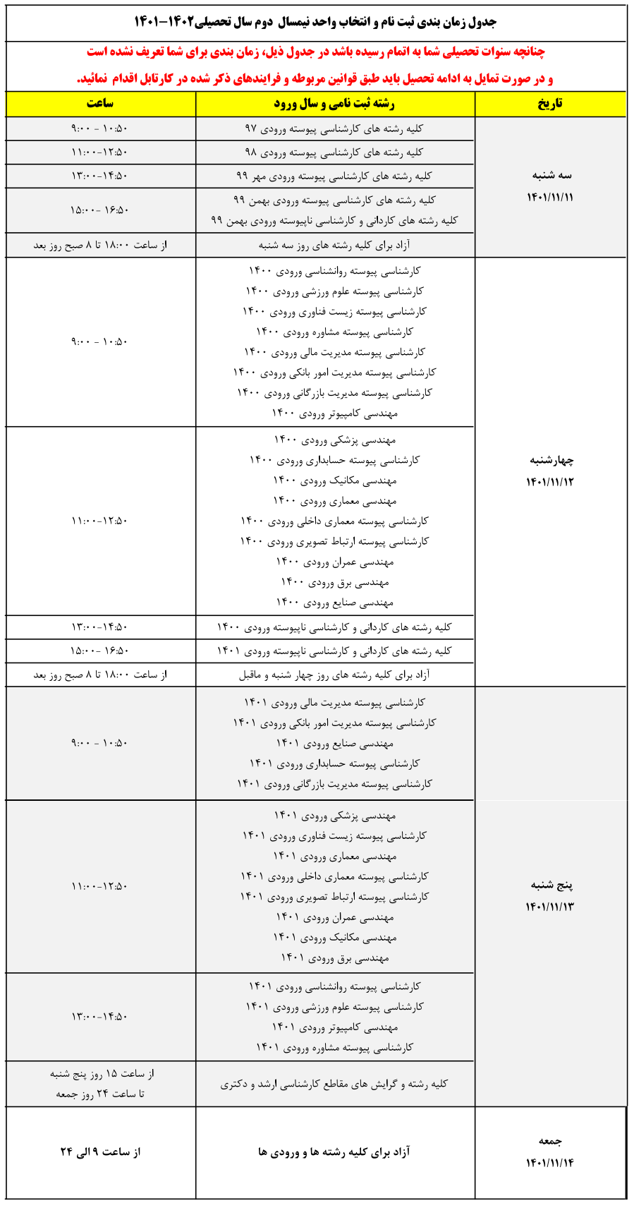 جدول زمانبندی انتخاب واحد اینترنتی نیمسال دوم سال تحصیلی 1402-1401