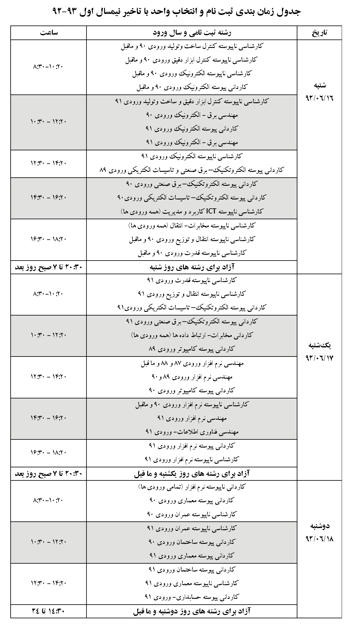 دانشجویانی که موفق به ثبت نام و انتخاب واحد اینترنتی در نیمسال اول سال تحصیلی 93-92 در موعد مقرر در تیرماه نشده اند، می بایست از روز شنبه مورخ 92/06/16 لغایت دوشنبه مورخ 92/06/18 مطابق با جدول زمان بندی زیر ضمن مراجعه به پورتال آموزشی نسبت به ثبت نام و انتخاب واحد با تاخیر اقدام نمایند.