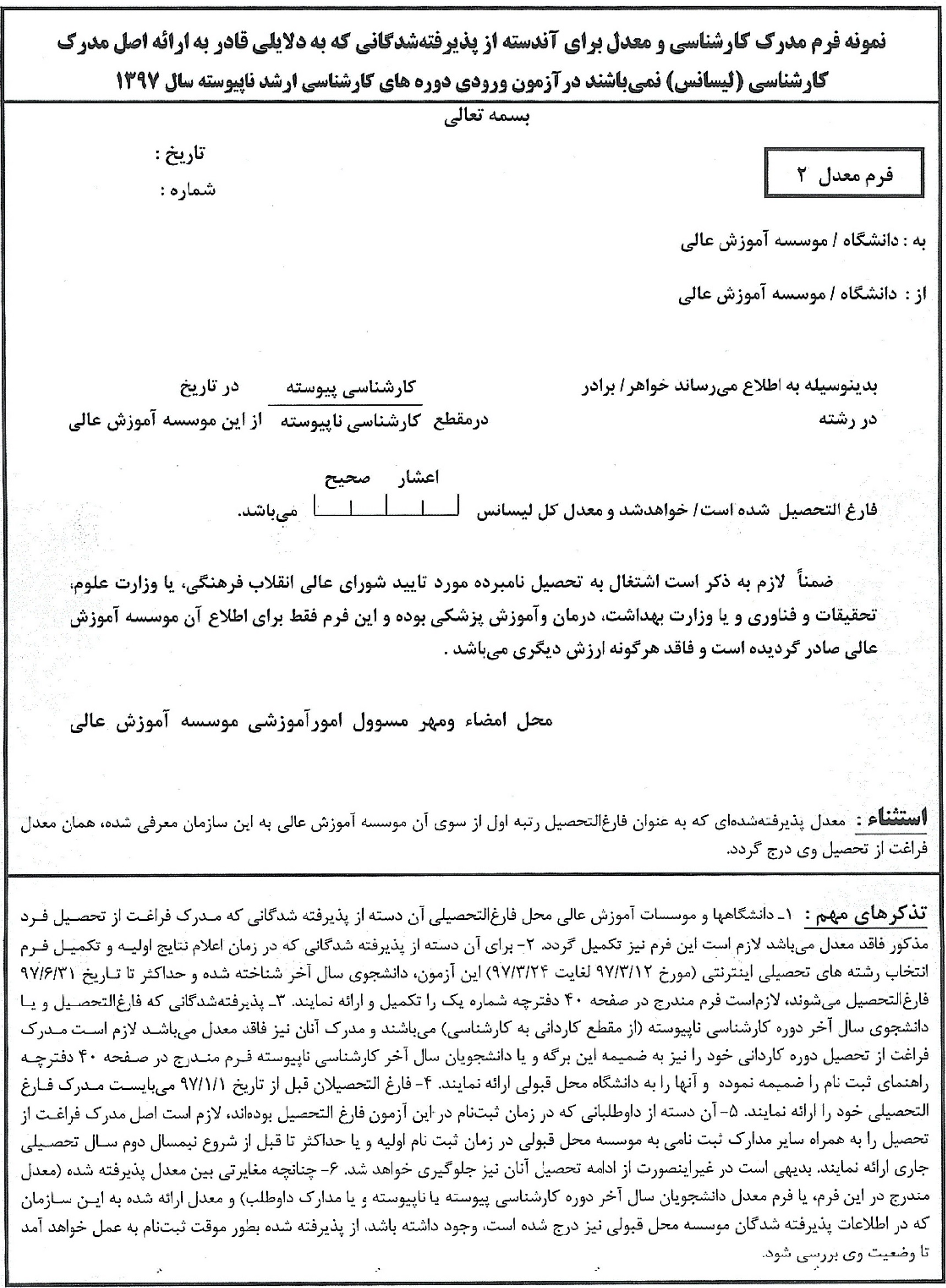 تبصره 1- پذيرفتهشدگاني كه به دلايلي قادر به ارائه اصل مدرك كارشناسي (ليسانس) نميباشند، لازم است اصل گواهي تاييد شده توسط دانشگاه يا موسسه آموزش عالي محل اخذ كارشناسي (ليسانس) با محتوي فرم ذيل اين اطلاعيه (اين فرم از دانشگاههاي محل قبولي قابل دريافت است) را ارائه نمايند.
