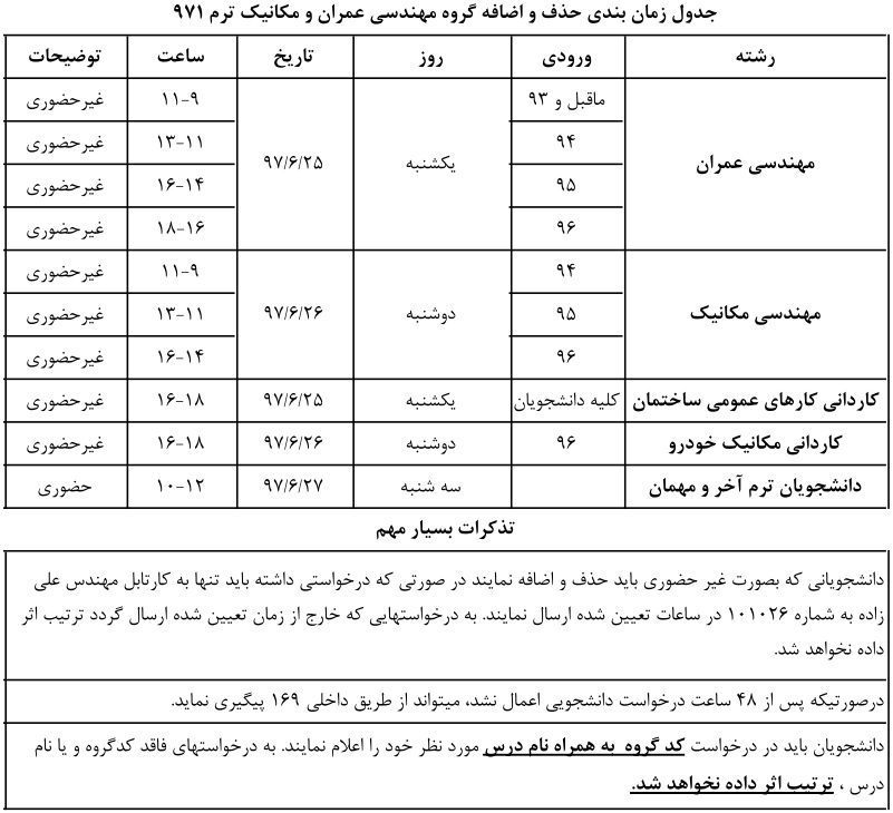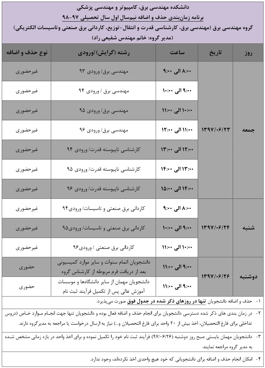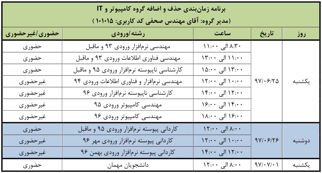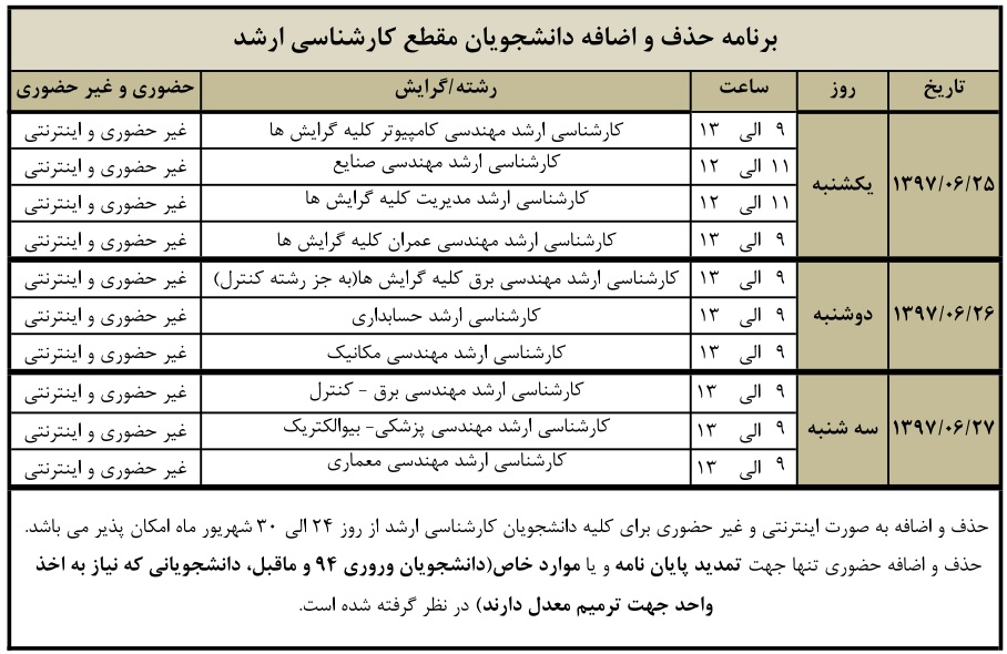 1- حذف و اضافه دانشجویان تنها در روزهای ذکر شده در جداول ذیل صورت می پذیرد.