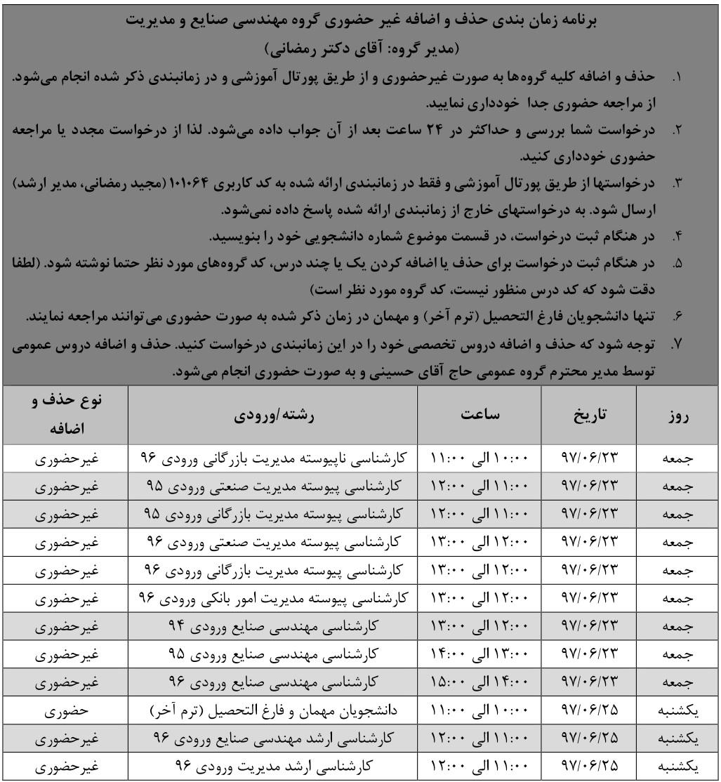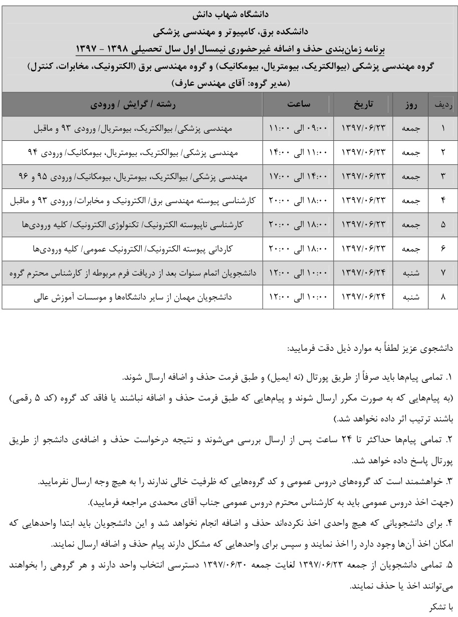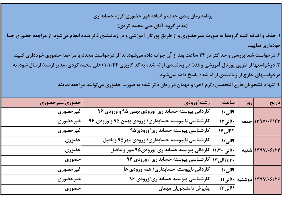 5- توجه داشته باشید که در زمانهای اعلام شده در اطلاعیه زمانبندی حذف و اضافه برای گروههایی که حذف و اضافه آنها غیرحضوری است فقط حذف و اضافه از طریق ارسال پیام به صورت غیرحضوری انجام میپذیرد؛ لذا دانشجویان در این زمانها به هیچ عنوان به شکل حضوری به مدیر گروه مراجعه ننمایند.