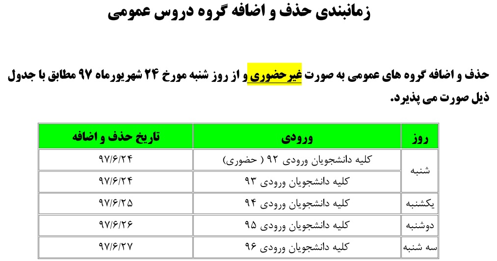 7- حذف و اضافه گروه های عمومی به صورت غیرحضوری و مطابق با جدول ذیل صورت می پذیرد.