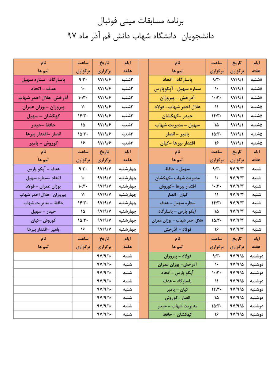 برنامه مسابقات مینی فوتبال دانشجویان دانشگاه شهاب دانش آدر ماه 97
