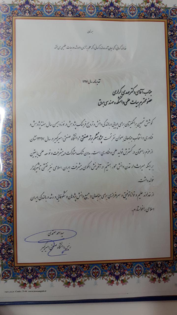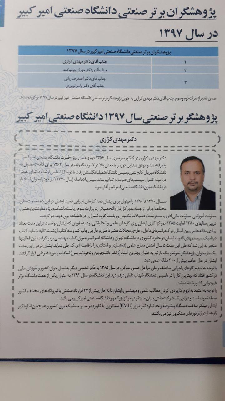 انتخاب پروفسور کراری به عنوان پژوهشگر برتر دانشگاه صنعتی امیر کبیر