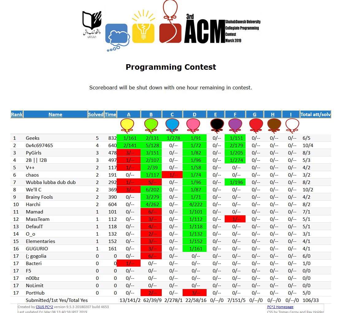 سومین دوره مسابقات برنامه نویسی دانشجویی استانی ACM در روزهای 16 و 17 اسفند ماه سال 97، همچون دو دوره گذشته به میزبانی دانشگاه شهاب دانش برگزار گردید. در این دوره از مسابقات برنامه نویسیACM تعداد 22 تیم از دانشگاه های استان با یکدیگر به رقابت پرداختند.