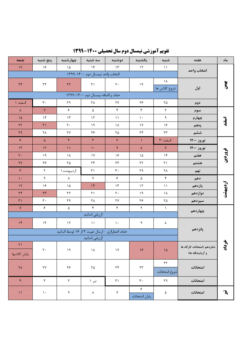 تقویم آموزشی نیم سال دوم 1400-1399