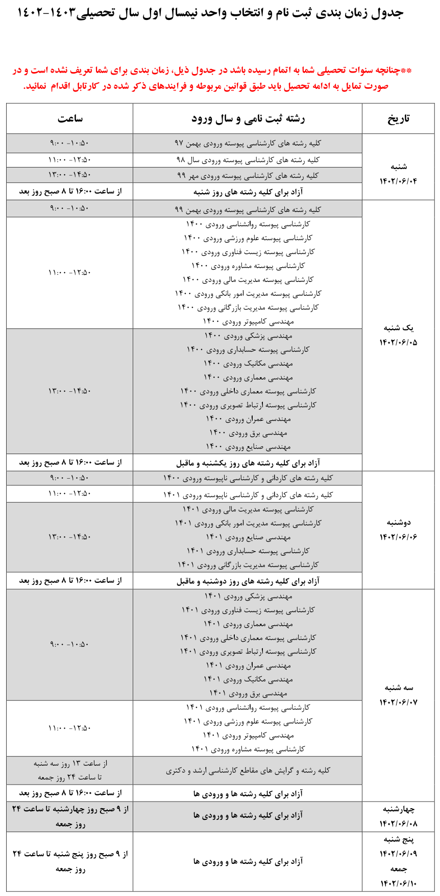 جدول زمانبندی انتخاب واحد اینترنتی ترم اول سال تحصیلی 1403-1402