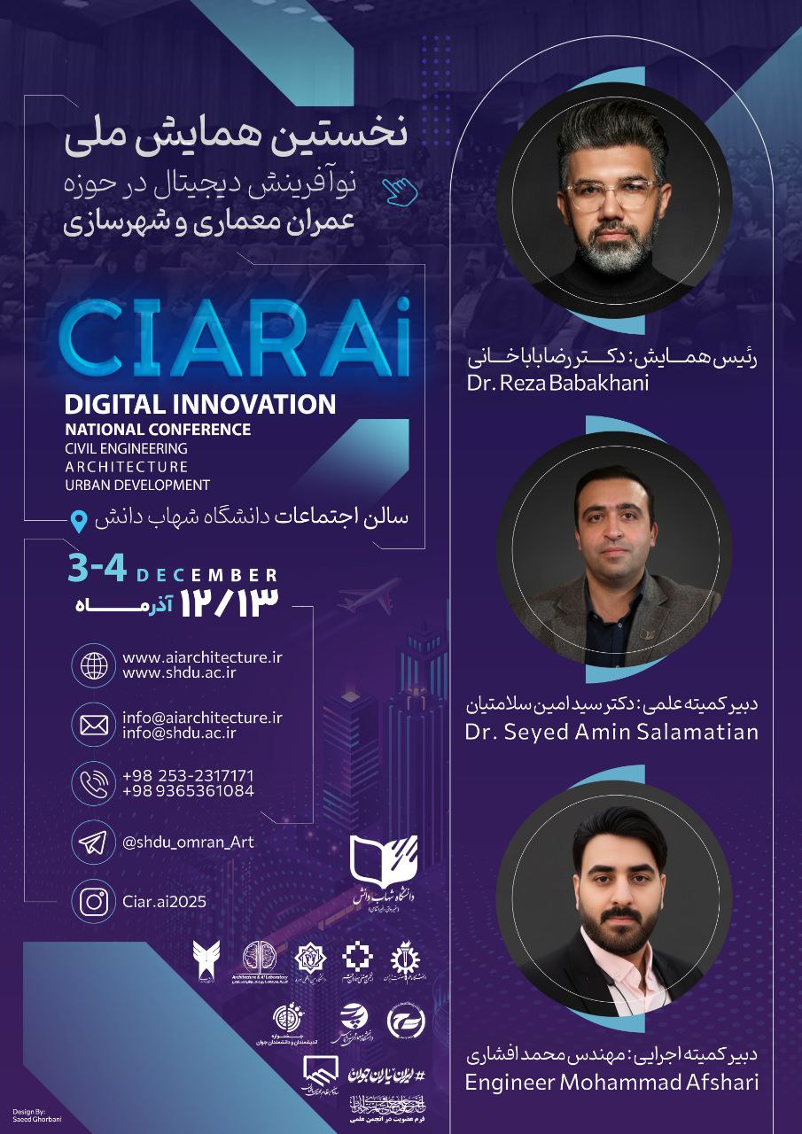 🔹دانشگاه شهاب دانش قم در روزهای ۱۲ و ۱۳ آذرماه ۱۴۰۴ (۳ و ۴ دسامبر ۲۰۲۵) میزبان نخستین همایش ملی نوآفرینی دیجیتال در حوزه عمران، معماری و شهرسازی (CIARAi) خواهد بود.