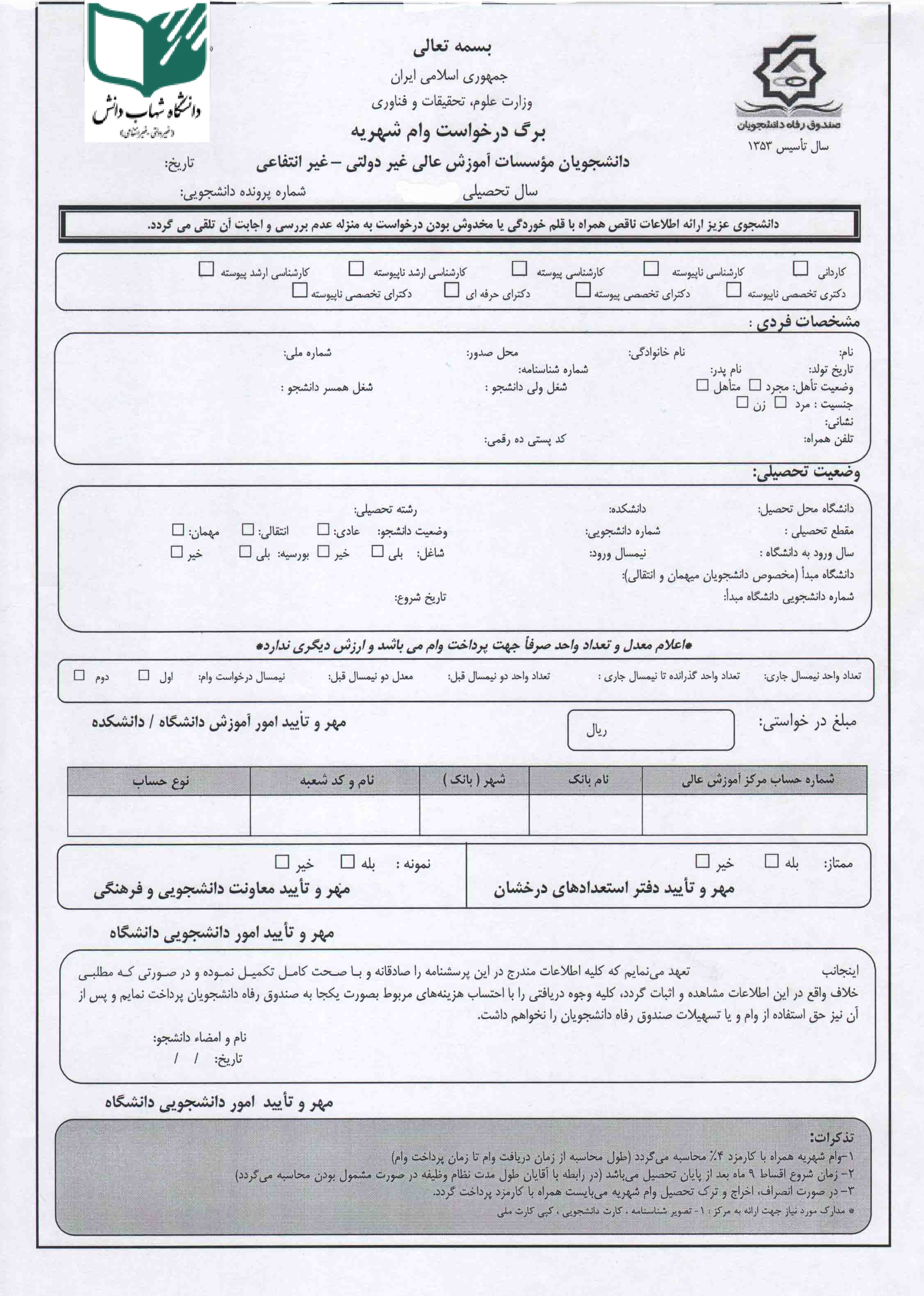 فرم مشخصات دانشجویان متقاضی وام شهریه